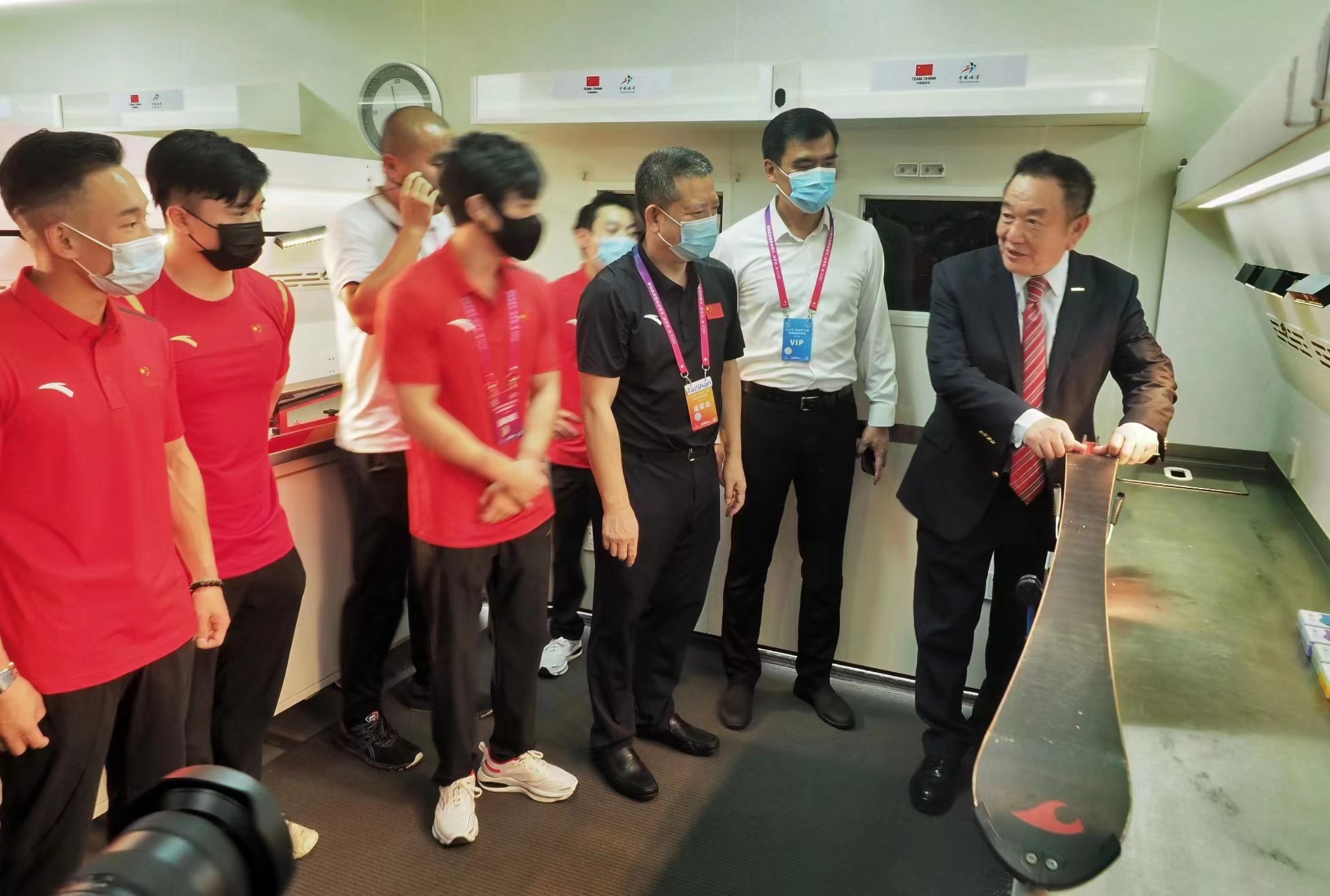 “这是我们‘国内首创、世界领先、完全国产’的雪蜡车,在2022年北京冬奥会上,就是它服务了越野滑雪国家队,见证了国家队取得历史上最好成绩……”雪蜡车上,大家一边听着车长安泽涛的讲解,一边好奇地体验车上的各种先进设备,满目惊叹之余生出了满满的民族自豪感。“我们民族自主科技品牌越来越强了!”一位运动员感叹道。